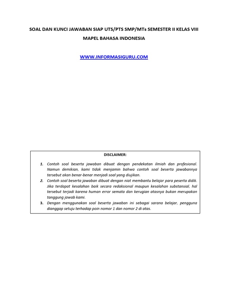 Untuk mendapatkan latihan soal secara lengkap, silahkan klik link pdf di bawah ini. Kumpulan soal kelas 8 smt 2 / yadi82. Soal pts uts 2 bahasa indonesia kelas 8 smt 2 smp mts berbasis teks. Soal latihan ukk/pat kelas 8 semester 2 (genap) bahasa indonesia kurikulum 2013 16 mei, 2021 posting komentar 1. Latihan soal 1 teks ulasan latihan soal teks ulasan kelas 8 id: Untuk membantu anda memahami lebih tentang teks ulasan tentunya anda harus mengerjakan soal dari materi ini mau itu soal pilihan ganda ataupun soal essay. Bacalah teks ulasan berikut ini dengan cermat untuk menjawab soal nomor 2, 3, dan 4! Dalam tulisan ini admin akan berbagi link download latihan soal pat smp kelas 8 kurikulum 2013 file format pdf. Soal bahasa indonesia kelas 8 draft. Jawablah soal esay berikut dengan baik dan benar! Aspek menarik patut dicatat adalah kesadaran raditya dika terhadap plot film sebagai entitas berbeda dan merdeka dari jajahan sumber adaptasinya. Soal bahasa inggris kelas 8 by guru saputra posted on december 28 2019 december 28 2019 hai sobat kali ini kami membahas artikel soal bahasa inggris kelas 8 smpmts tahun 2020 2021 lengkap soal pg essay unutk kurikulum 2021 pelajaran ibi semester 1 dan 2. Untuk membantu anda memahami lebih tentang teks ulasan, tentunya anda harus mengerjakan soal dari materi ini, mau itu soal pilihan ganda ataupun soal essay.